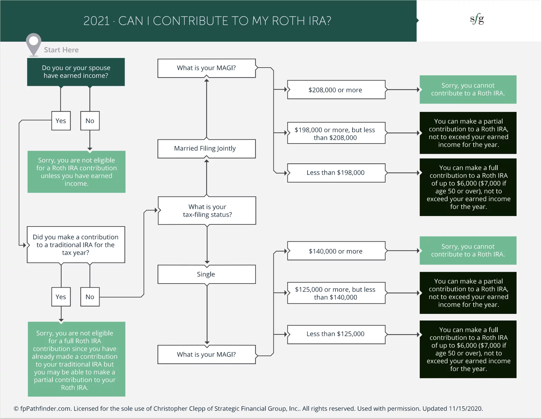 I hope this has been helpful to you and understanding whether or not you can contribute to a Roth IRA, please reach out to me with any questions. Contribution limits and MAGI income limits are based on the 2021 tax year.
